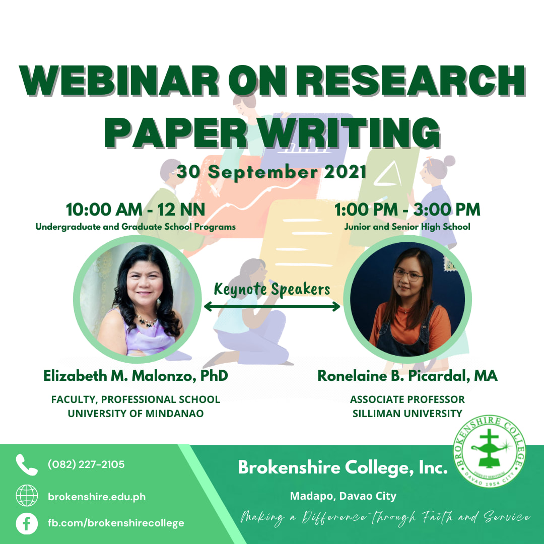 In line with its commitment to promote research integrity and academic excellence, Brokenshire College, through the Research and Publication Office, hosted a Webinar on Research Paper Writing on September 30, 2021, via Zoom.