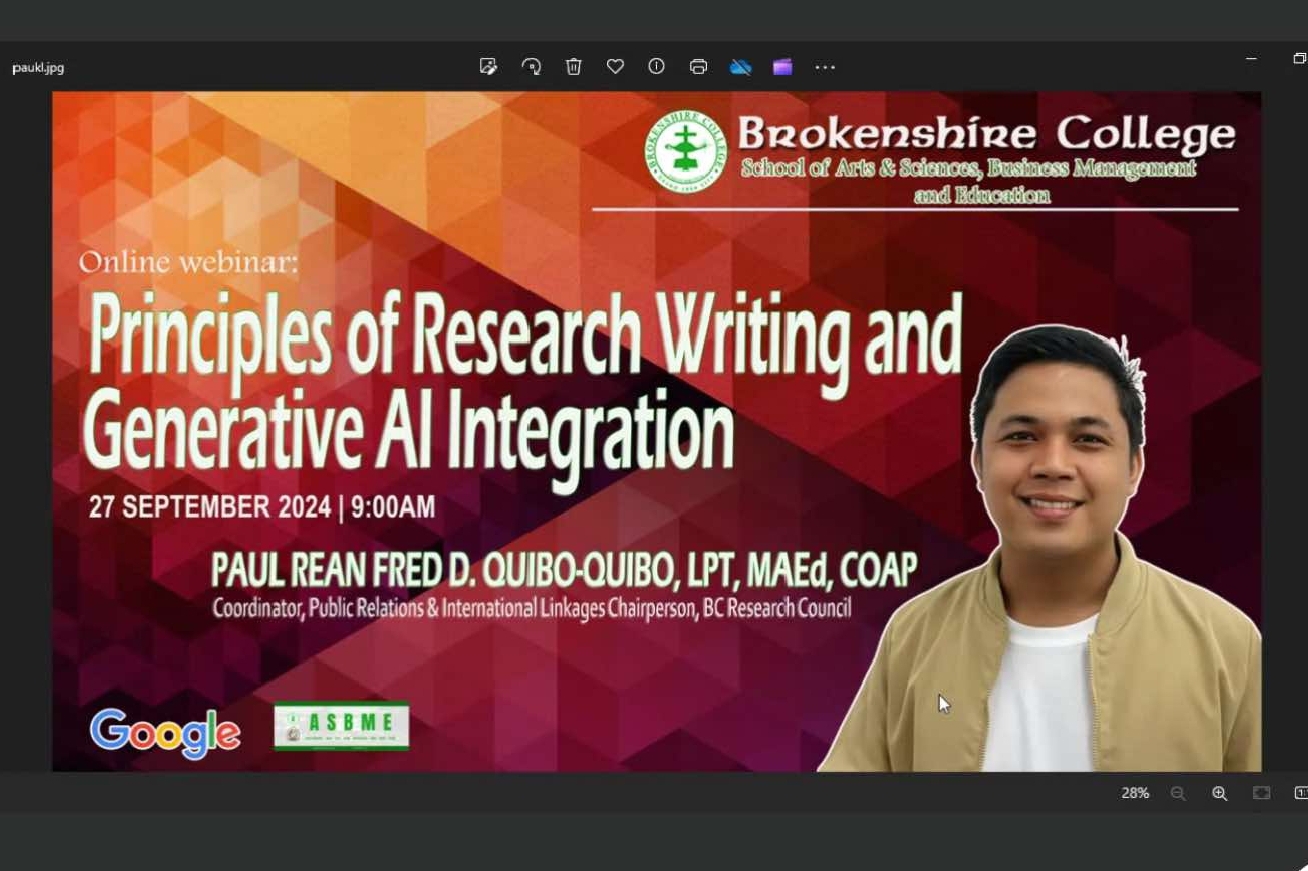 At the tertiary level, research writing is required in every program, and with this webinar, the guest speaker, Mr. Paul Rean Fred D. Quibo-Quibo, LPT, MAEd, COAP, also a chairperson in BC Research Council, shared his valuable insights on how to write a research paper effectively. He started with the basics such as exploring the different parts of the paper, and the proper format for each section, until he discussed the integration of artificial intelligence in writing.